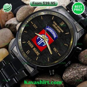 The 82nd Airborne Division Custom Watch is a must-have accessory for any proud American and military enthusiast. This sleek and stylish timepiece pays tribute to the brave men and women who have served in the legendary division known for its elite paratrooper forces. Crafted with precision and attention to detail, this custom watch features the distinctive emblem of the 82nd Airborne Division prominently displayed on the watch face. The emblem serves as a constant reminder of the dedication, sacrifice, and patriotism of those who have worn the unit’s coveted insignia. This watch is not only a symbol of honor and respect but also a functional and reliable timekeeping device. The durable stainless steel case and scratch-resistant mineral crystal ensure longevity and durability, while the Japanese quartz movement provides accurate timekeeping. Whether you are a veteran, active-duty service member, or simply a supporter of the military, this custom watch is a statement piece that shows your pride and allegiance to the 82nd Airborne Division. It is a conversation starter, a symbol of camaraderie, and a daily reminder of the values and traditions that define the division’s legacy. Give yourself or a loved one the gift of this remarkable watch and show your support for the men and women who have served and continue to serve in the 82nd Airborne Division. Wear it with pride, honor, and respect for the heroes who have earned the right to wear the revered “AA” patch. 82nd Airborne Division Custom Watch