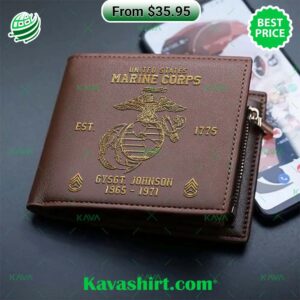 A classic piece of jewelry honoring the courageous men and women who serve our nation, present to you the U.S. Marine Corps Custom Leather Wallet. This wallet is made by hand from leather of the highest caliber and radiates strength, style, and nationalism. This wallet is a representation of sacrifice and respect rather than just a chic accessory. With the Marine Corps symbol engraved on its exterior, it acts as a constant reminder of the steadfast devotion and commitment of our Marines. This wallet provides functionality without sacrificing design, with many card slots, a currency pocket, and a modern look. Because of its small size, it’s perfect for daily usage whether you’re working or not. Selecting this personalized leather wallet is a way to honor those who defend our country as well as a statement of style. It acts as a discussion starter for others who have similar ideals and demonstrates support for the Marine Corps community. Show your support for our military troops with this U.S. Marine Corps Custom Leather Wallet. Knowing that every purchase you make is going toward a deserving cause, carry it with respect and pride. Invest in a wallet that not only stores your necessities but also conveys a message of bravery, loyalty, and friendship. Grab hold of this distinctive item right now to make a statement that transcends style. U.S. Marine Corps Custom Leather Wallet