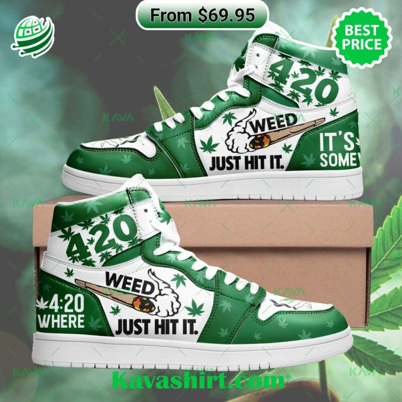 Imagine if your sneakers could whisper secrets – an unspoken code for the chillest vibes imaginable. That’s precisely what the limited-edition “Weed Just Hit It, It’s 420 Somewhere” Air Jordan 1s promise, a wearable homage to all things green and good. The “Weed Just Hit It, It’s 420 Somewhere” Air Jordan 1 isn’t just another shoe; it’s a counterculture statement brought to life. From the iconic high-top silhouette to the carefully crafted details, this sneaker oozes a playful attitude that celebrates the cannabis lifestyle. Custom Artwork: It’s All in the Details: Look closely, and you’ll find whimsical marijuana leaf graphics peeking playfully from unexpected places. The iconic Air Jordan logo gets a hazy makeover, while the tongue cheekily displays the phrase “Weed Just Hit It, It’s 420 Somewhere.” These aren’t your run-of-the-mill Jordans; these tell a story. Materials That Speak to Comfort & Style: This isn’t just a showpiece; it’s a shoe created to be worn. Premium leather construction forms the base of these high-tops, ensuring a comfortable and stylish fit. The classic Air Jordan sole technology delivers that signature bouncy feel, making them perfect for hitting the streets or simply chilling out. If you’re a sneaker enthusiast with a taste for the unconventional, if you believe in the power of relaxed vibes, and if you love rocking a unique look, then the “Weed Just Hit It, It’s 420 Somewhere” Air Jordan 1 is calling your name. Weed Just Hit It, It’s 420 Somewhere Air Jordan 1