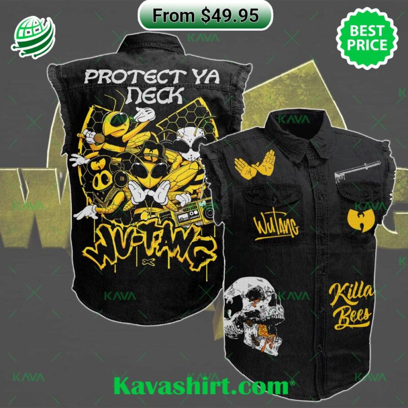 Channel the raw energy and timeless style of the Wu-Tang Clan with this limited edition Killer Bees denim jacket. A statement piece for any hip-hop head or streetwear connoisseur, this jacket pays homage to the iconic group’s legacy, blending rebellious attitude with a classic denim silhouette. Crafted from premium black denim, the jacket boasts a rugged, lived-in feel that exudes old-school cool. The sleeveless design offers a modern twist, providing a relaxed and versatile fit perfect for those warmer days. Emblazoned across the back, the iconic Wu-Tang “W” and the fierce Killer Bees swarm in vibrant yellow – a symbol of the clan’s undeniable power and lyrical mastery. This jacket isn’t just about the look; it’s about the attitude. It’s a testament to the spirit of hip-hop – a culture of self-expression, defiance, and undeniable swagger. Slip it on and feel the energy of the Wu-Tang Clan pulse through you. Whether you’re hitting the streets, rocking a festival stage, or simply chilling with your crew, the Wu-Tang Clan Killer Bees Denim Jacket is the perfect way to rep your love for one of hip-hop’s most influential groups. Wu-Tang Clan Killer Bees Protect Ya Neck 2D Sleeveless Denim Jacket